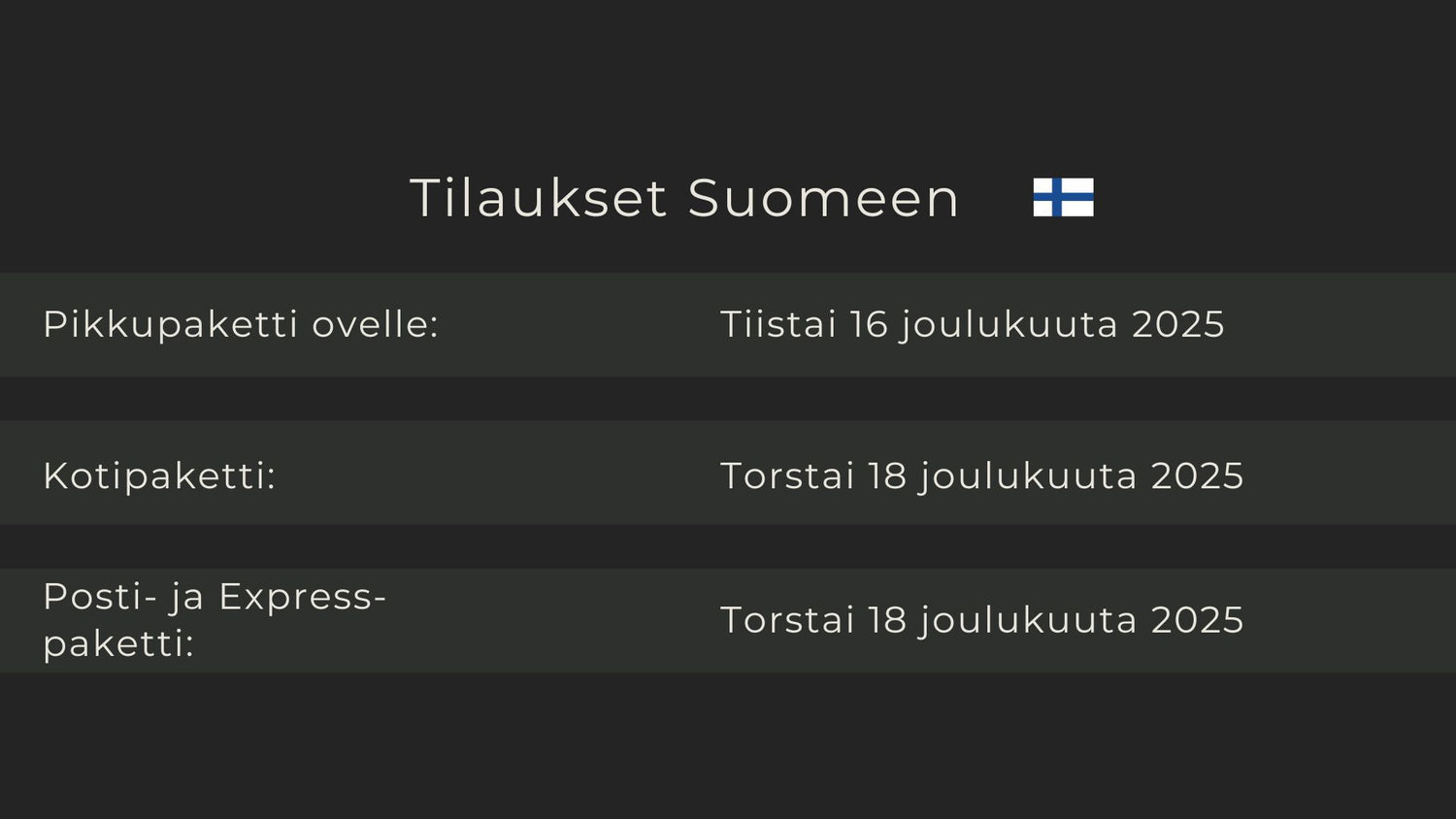 Jos tilaat tuotteita Suomeen ja haluat ne perille jouluksi, tee tilauksesi viimeistään 18.12.2025.