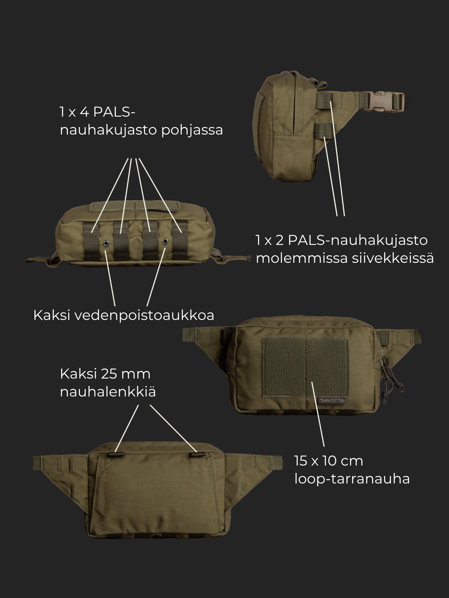 Keskikokoinen vyölaukkumalli monipuolisilla sisätilan organisointimahdollisuuksilla ja lukuisilla ulkoisilla kiinnityspisteillä. Vyölaukut ovat luonnostaan monikäyttöisiä varusteita, Suur-Kukkaro vielä vähän enemmän kiitos monenlaisten kikkailuvaihtoehtojen, joiden avulla laukun saa muokattua sopivaksi erilaisiin käyttötarpeisiin.