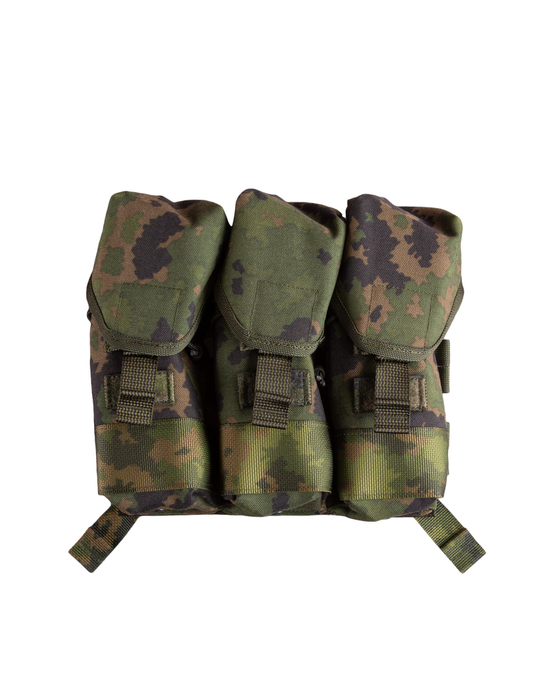 Läpällinen kolmen tuplalipastaskun placard-etuläppä 30 ptr AR15 ja AK lippailla. Yleismaailmallisesti yhteensopiva G-hook ja tarranauhakiinnitys.