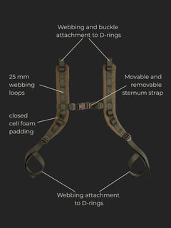 This is the complete shoulder strap assembly of the Kahakka backpacks, compatible with many of our and others packs and backs due to the simple yet universal webbing and buckle attachment system. Includes left and right shoulder strap, bottom straps and sternum strap.