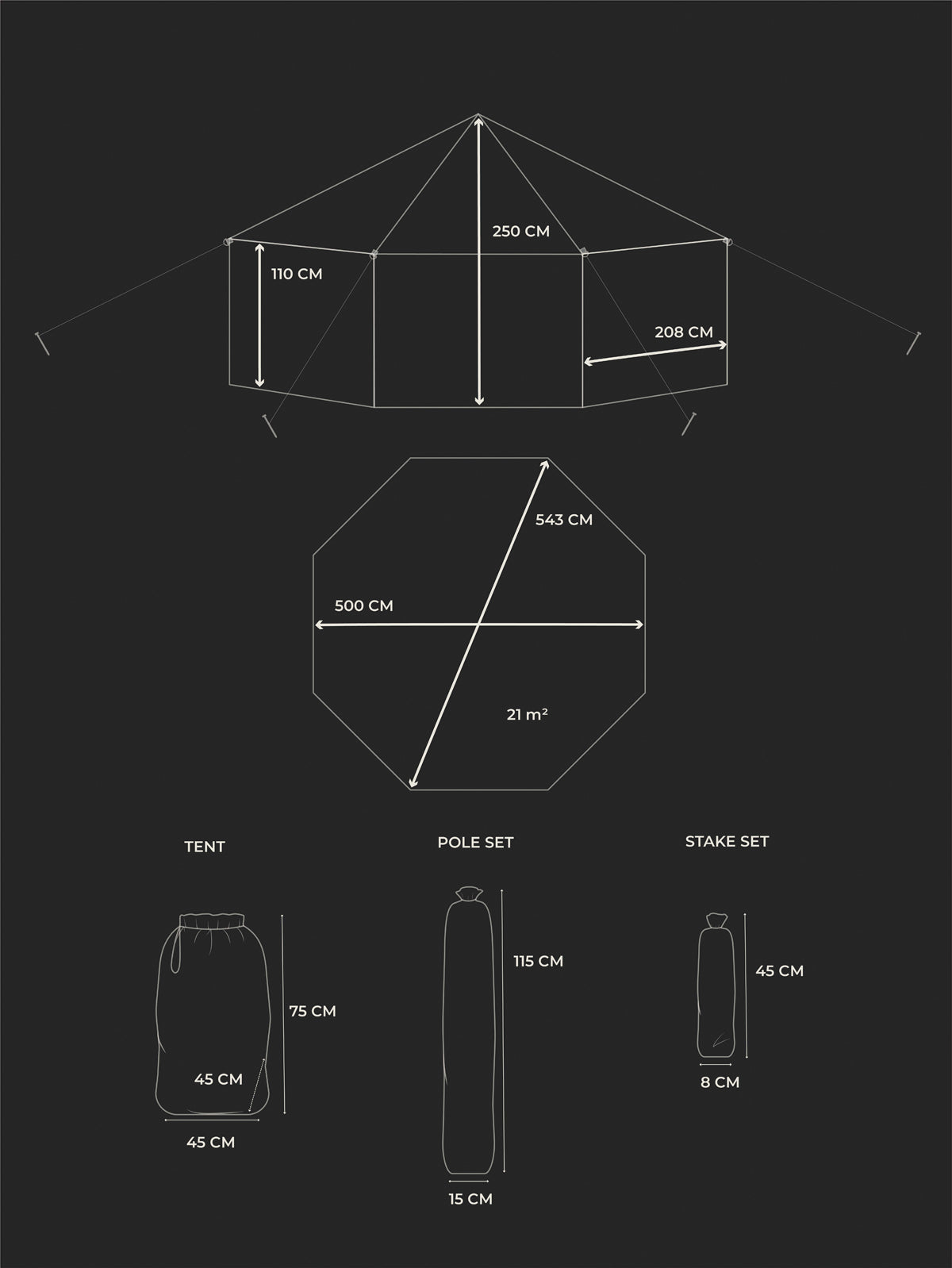 This complete tent package includes: tent (1 pc), centre pole (1 pc), corner poles (8 pcs) and stakes (8 pcs) and transport bags for the tent, pole set and stake set. Extra accessories such as groundsheet and stove are sold separately.